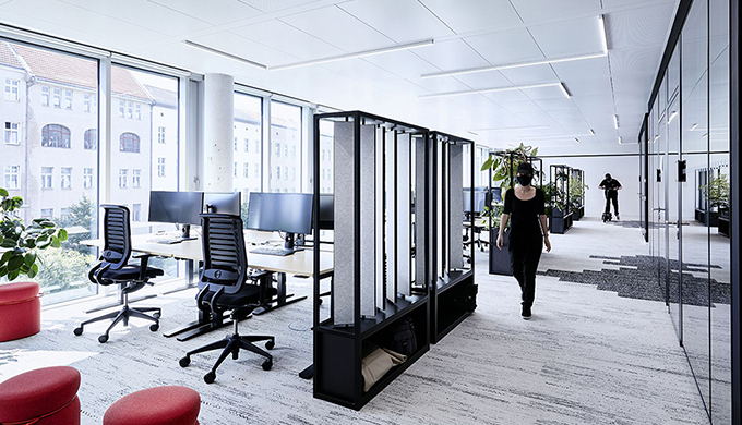 例如:白色的墻面和頂面配上灰色的地面,表現(xiàn)沉穩(wěn)的同時也可以減黑色辦公家具帶來的沉悶感